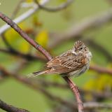 White eye ring. Dark ear patch. Streaked breast sometimes forms a central spot like Song Sparrow's. Chestnut shoulder.