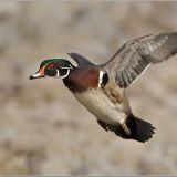 Male: distinctive multicolored surface-feeding duck. Head is crested and patterned in green, white and purple; throat white with chin strap; breast brown; bold white vertical side stripe; buffy sides and belly; glossy brown back and wings; red eye and mostly reddish bill.
