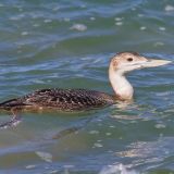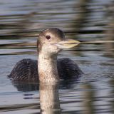83-95 cm (33-38") Uncommon. Arctic tundra lakes, winters along nw. Pacific Coast. Large diving bird with a stout dagger-like bill. Told from very similar Common Loon by its ivory or yellow bill which is often held slightly uptilted.