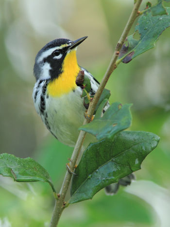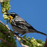 Plain gray upperparts. Yellow throat. White belly. Black and white face.